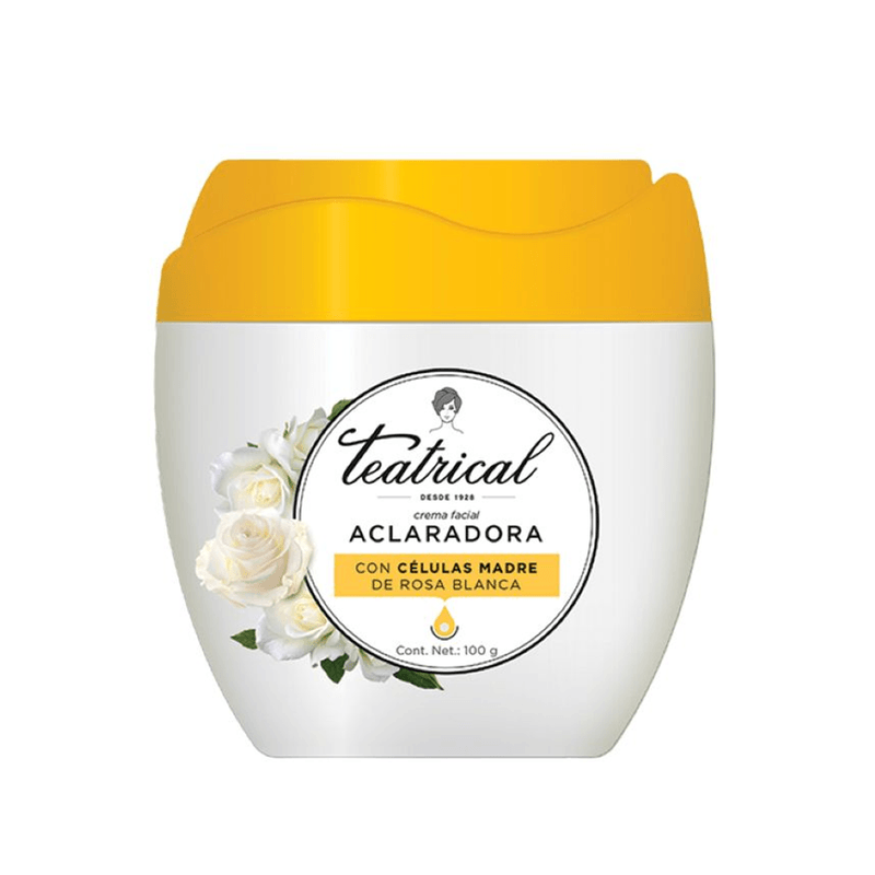 Teatrical Células Madre Aclaradora es una crema facial que contiene ingredientes que ayudan a prevenir las manchas en la piel, logrando un tono más uniforme. Su fórmula con células madre conocidas por brindar protección contra el estrés oxidativo, filtro uv y niacinamina actúan célula a célula sobre la piel para un efecto despigmentante. ayuda a aclarar y disminuir las manchas del rostro, humectando notablemente la piel.
